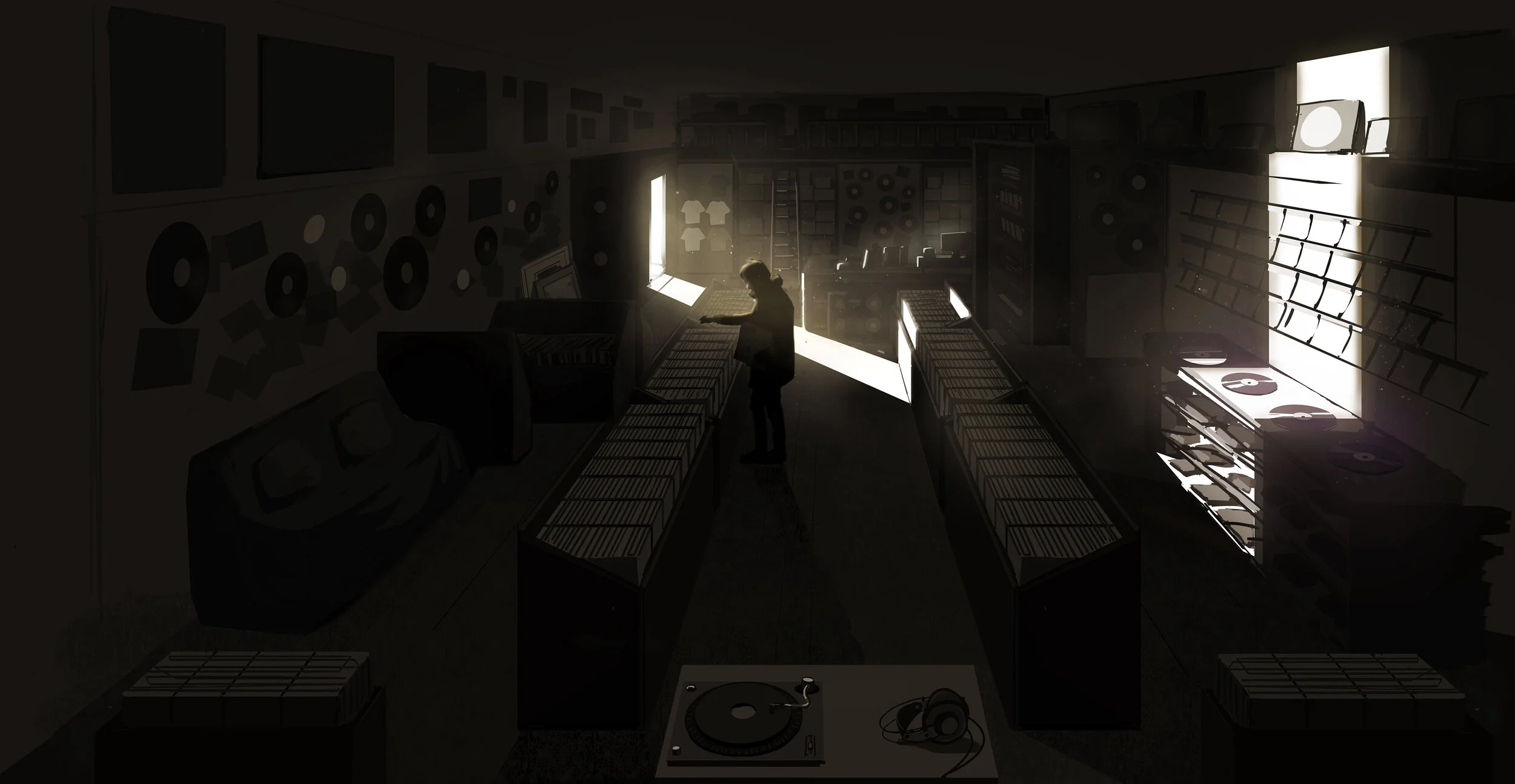 For Reggie Watt’s VR music video experience “Runnin’” directed by Kiira Benzing, I created the environment concept for the record store scene.
